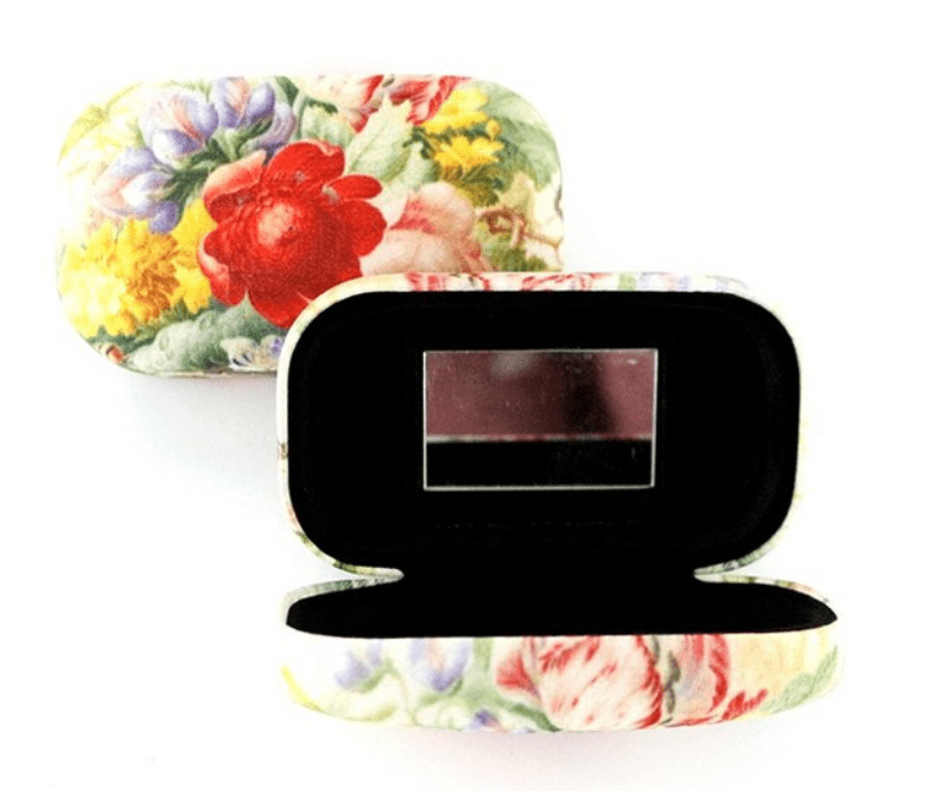En fin lille æske med spejl i - perfekt til en læbestift, kontaktlinser eller andre ting af beskeden størrelse. Selve æsken er af stofbetrukket metal og måler udvendigt ca. 8,5 cm x 4,8 cm.