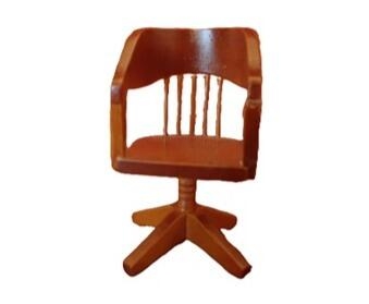 Drejestol af træ (kan dog ikke dreje rigtigt). Måler ca. 7,5 cm i højden (målt fra højeste sted øverst på ryggen)