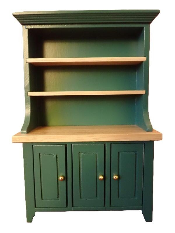 Meget flot køkkenskab/køkkenreol i grøn med fyrretræ. Skabene i underdelen kan åbnes, så der kan opbevares ting dernede.