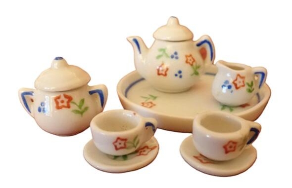 Sæt med porcelænsbakke, 2 kopper med underkopper, tekande, mælkekande og sukkerskål