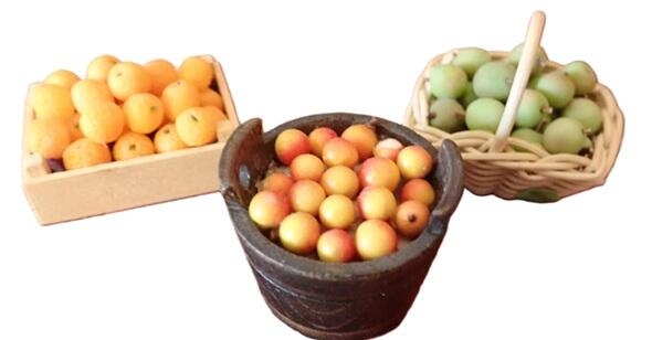 Æblekurv, appelsiner i kasse og en træbeholder med frugt.