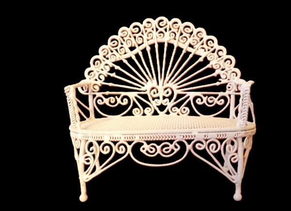Hvid havebænk i hvidt metal med flettet ryg m.m.