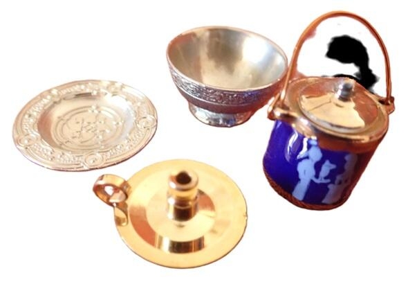 4 dele: Spand med låg, messinglysestage, skål og rundt fad