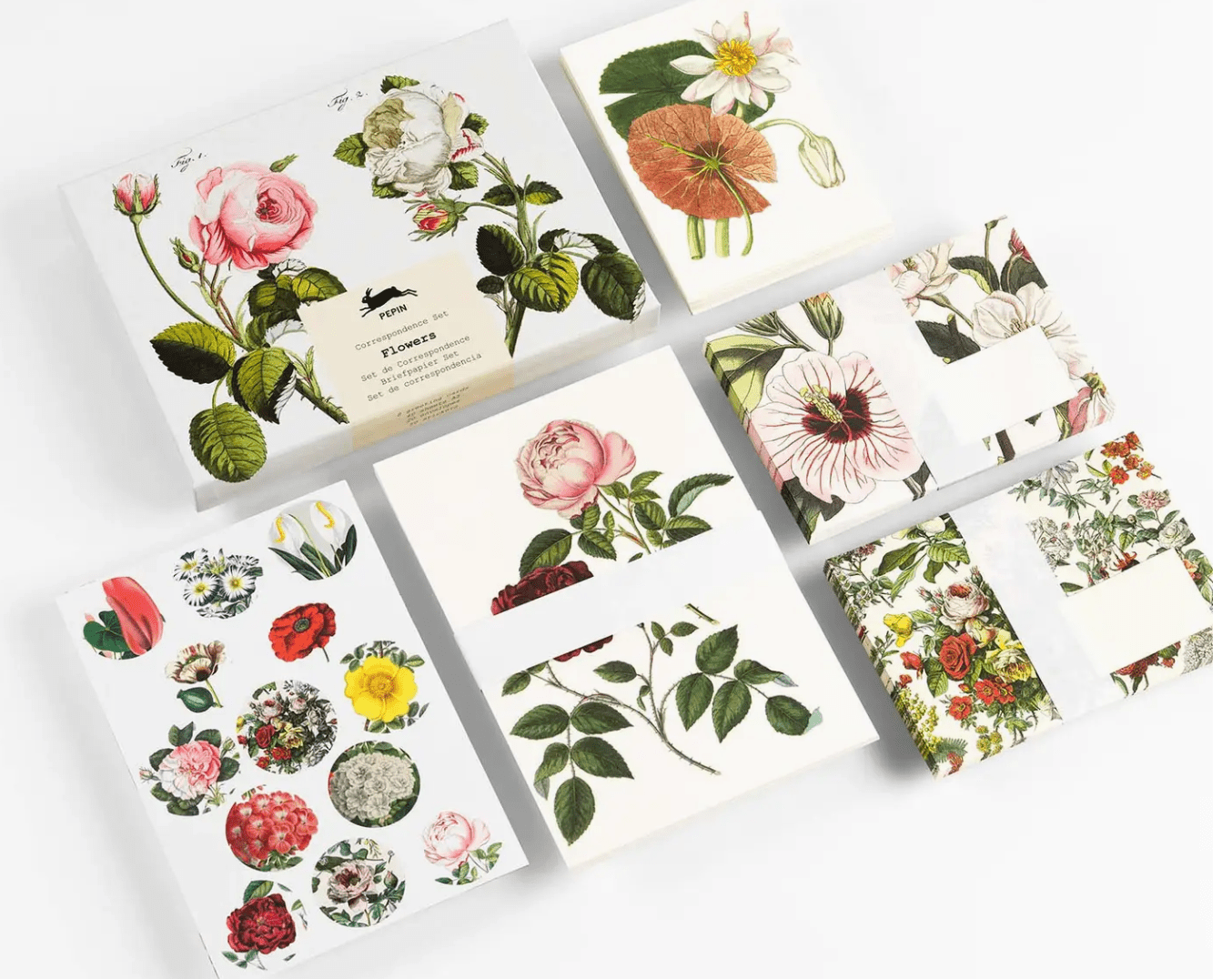 Det smukke skrivesæt her består af en æske med 10 ark skrivepapir med forskellige motiver på - 4 forskellige slags, så 40 ark i A5 størrelse med blomster.