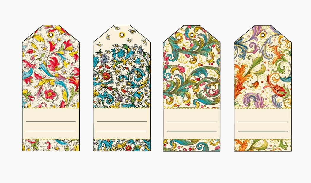 Disse meget smukke gavemærker med guldtryk og hul til snor sælges i poser med 5 stk.