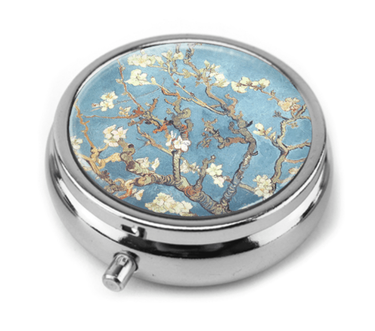 Smuk lille pilleæske i metal med blomster på låget. Indvendigt er æsken inddelt i små rum.