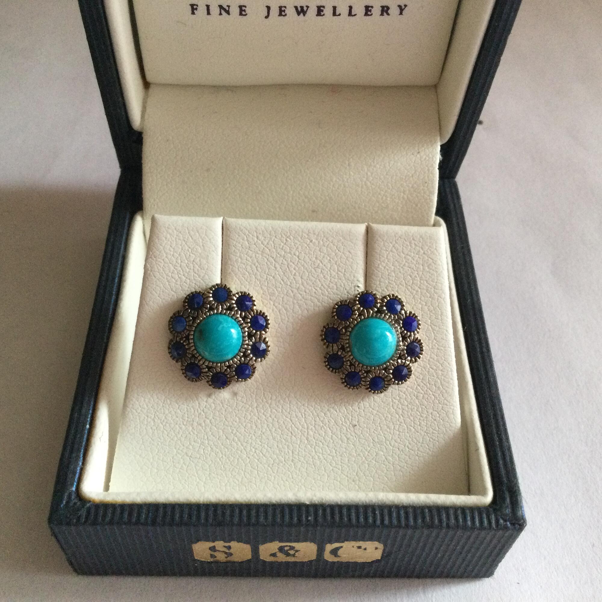 Virkelig fine små øreringe i sølv (mærket 925) med turkis og lapis lazuli sten. Til huller i ørene.