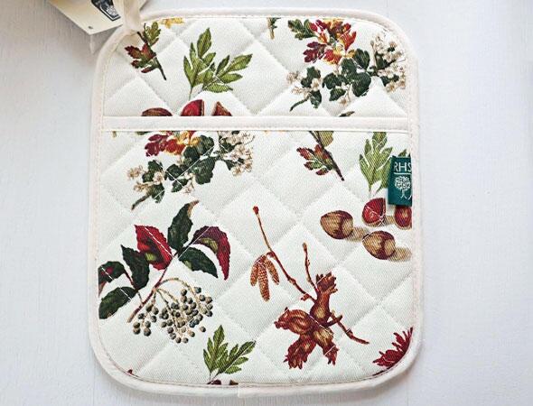 Tyk og praktisk grydelap med efterårsmønster.
